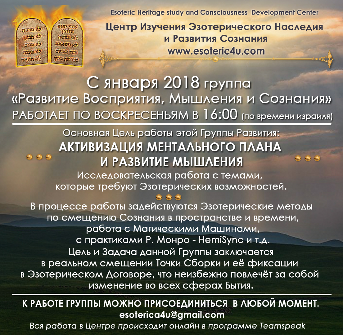 С января 2018 года онлайн группа "Развитие Восприятия, Мышления и Сознания" работает по воскресеньям в 16:00 (по времени Израиля)