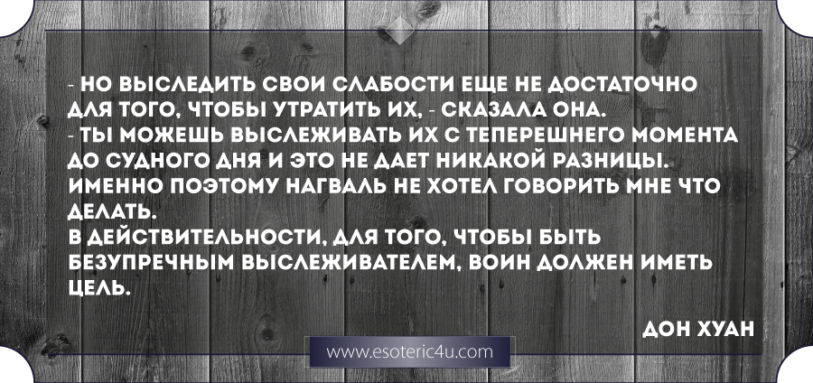 - Но выследить свои слабости еще не достаточно для того, чтобы утратить их, - сказала она. - ты можешь выслеживать их с теперешнего момента до судного дня и это не дает никакой разницы. Именно поэтому Нагваль не хотел говорить мне что делать. В действительности, для того, чтобы быть безупречным выслеживателем, воин должен иметь цель.