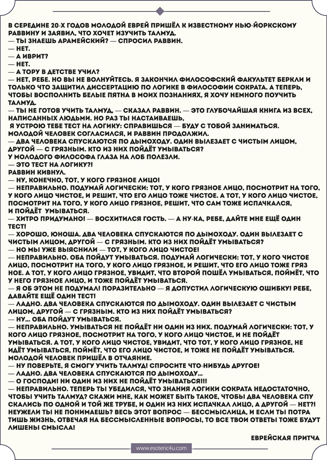 — Ты не готов учить Талмуд, — сказал раввин. — Это глубочайшая книга из всех, написанных людьми. Но раз ты настаиваешь, я устрою тебе тест на логику: справишься — буду с тобой заниматься.