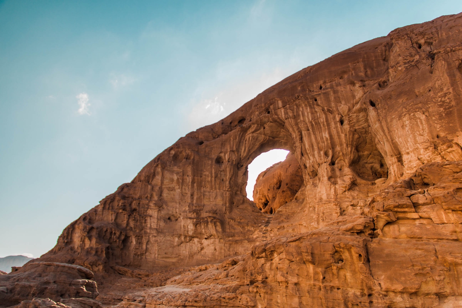 На поверхности скалы сделаны удобные металлические лесенки, ступеньки, перила, чтобы можно было залезть прямо в эту арку, пройти насквозь и спуститься с другой стороны.