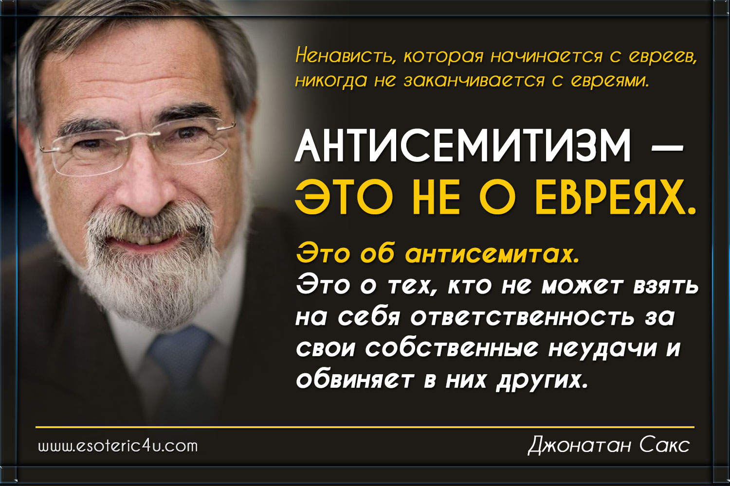 Антисемитизм — это не о евреях. Это об антисемитах. Это о тех, кто не может взять на себя ответственность за свои собственные неудачи и обвиняет в них других. Исторически, если вы были христианином во время крестовых походов или немцем после Первой мировой войны и увидели, что мир не повернулся в желательном вам направлении, вы винили евреев. Это именно то, что происходит сегодня. И невозможно преувеличить опасность этого. Не только для евреев, но и для всех, кто ценит свободу, милосердие и человечность.